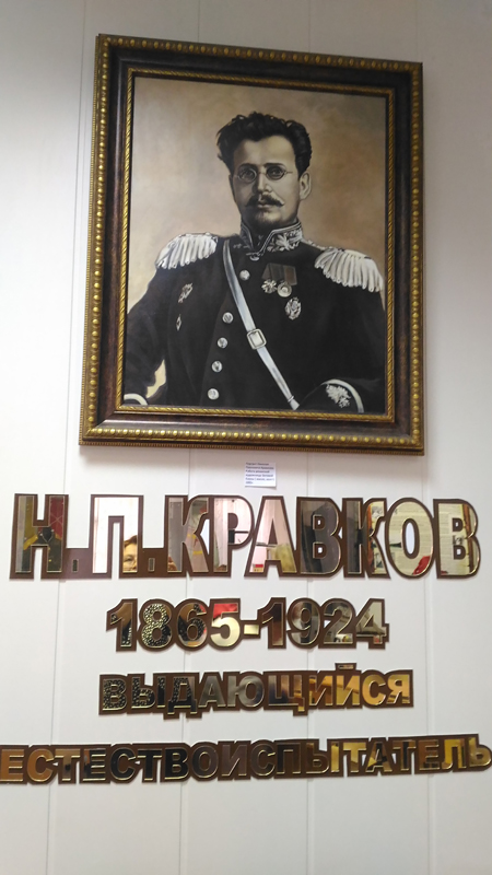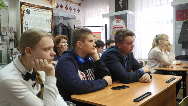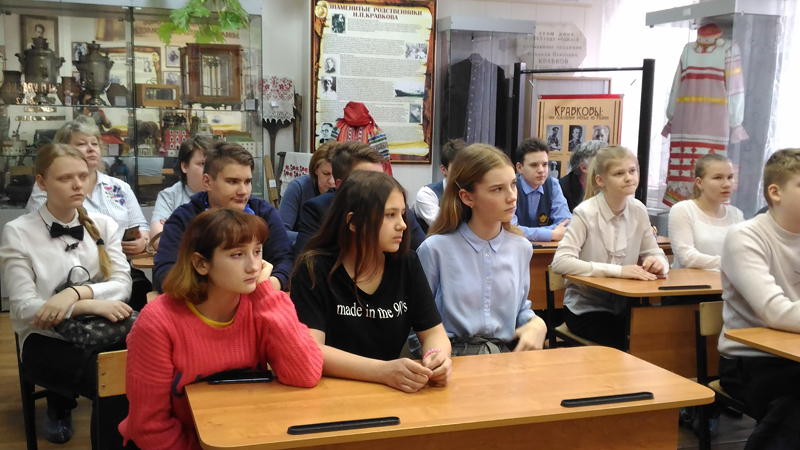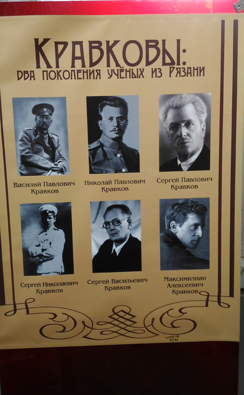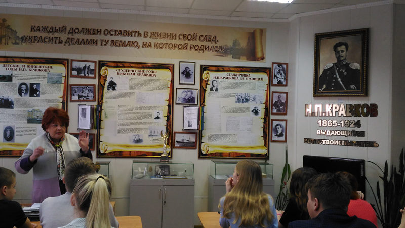 Создатель и руководитель музея Светлана Васильевна Березняговская рассказала об истории здания, в которое в 1850 году переселилась из Калуги семья Кравковых, а ныне располагается школа. В семье Павла Алексеевича и Авдотьи Ивановны родилось шесть мальчиков; по окончании 1-й мужской гимназии все они поступили в университеты, но трое умерли молодыми, а другие три брата приобрели мировую известность в науке.