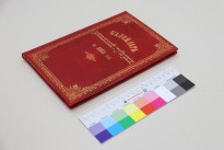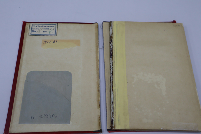 – Восстановление утраченных элементов. Утраченные фрагменты покрывного материала на уголках и торцах крышек были восполнены реставрационными вставками из батиста путем подведения под оригинальное тканевое покрытие и тонированы максимально приближенно к исходному цвету. Новый корешок был изготовлен из коленкора, подходящего к оригиналу по фактуре и цвету, и смонтирован на переплетную конструкцию.