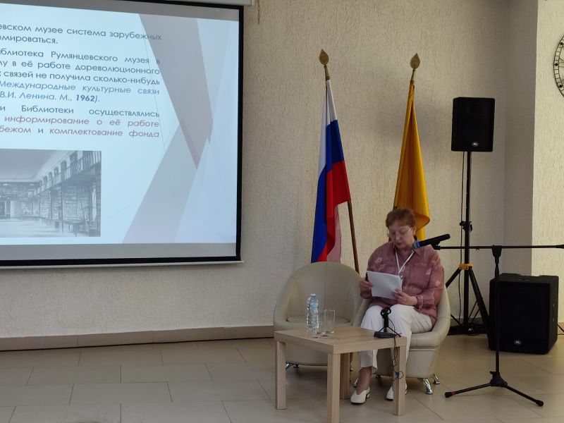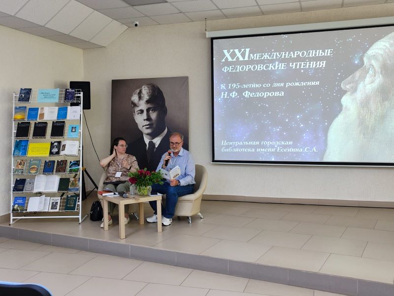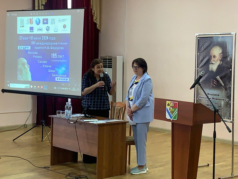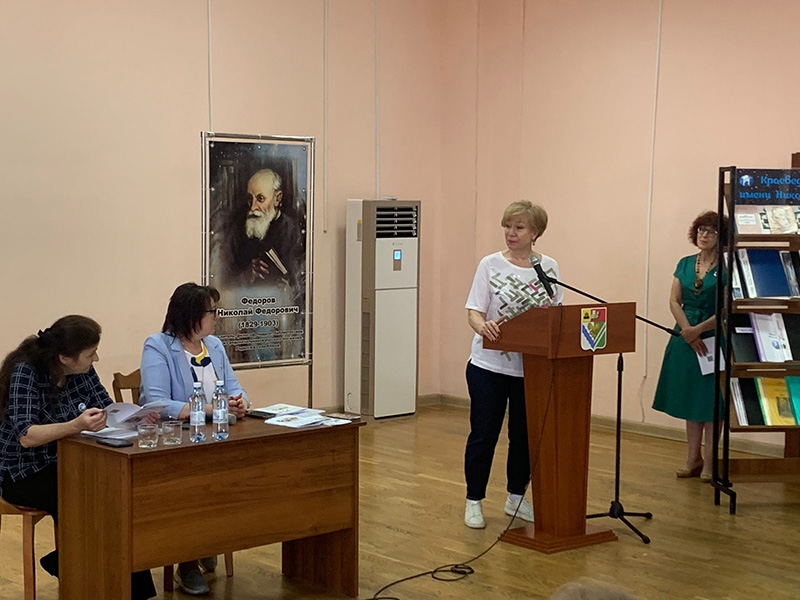 30 мая в продолжение XXI Международных научных чтений, посвященных 195-летию со дня рождения Николая Федоровича Федорова, в Центральной городской библиотеке имени С.А. Есенина состоялась торжественная церемония награждения благотворителей, подвижников, меценатов под названием «Жить по-федоровски». После торжественного мероприятия прошло научное заседание чтений. Модераторами этой секции выступили кандидат исторических наук, ученый секретарь Рязанской областной библиотеки имени Горького Владимир Анатольевич Горнов и кандидат филологических наук, старший научный сотрудник Института мировой литературы имени А.М. Горького РАН Анна Леонидовна Гумерова. В секции приняли участие ученые из Москвы, Липецка и Рязани. В числе представленных докладов с темой «Н.Ф. Федоров и международные связи библиотеки Московского публичного и Румянцевского музея в конце XIX – начале XX века» выступила кандидат педагогических наук, главный научный сотрудник Рязанской областной библиотеки имени Горького Ирина Георгиевна Хомякова.
