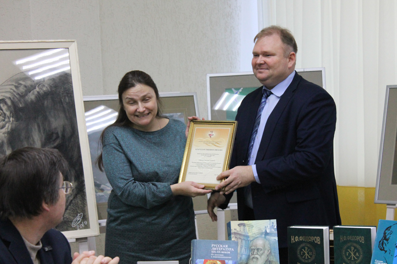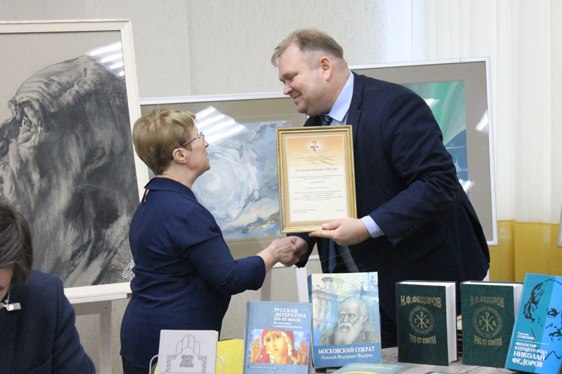 Заместитель начальника отдела координации деятельности учреждений культуры министерства культуры и туризма Рязанской области Сергей Владимирович Селявин вручил благодарственные письма всем организаторам юбилейных мероприятий. Он отметил, что это была разнообразная, порой очень сложная и ответственная работа. Доктор филологических наук, главный хранитель Музея-библиотеки Н.Ф. Федорова Анастасия Георгиевна Гачева представила лекцию о влиянии идей Николая Федорова на русскую литературу. Ученый секретарь библиотеки имени Горького вручила почетные дипломы и призы школьникам – участникам межрегионального конкурса «Философ будущего Николай Федоров».