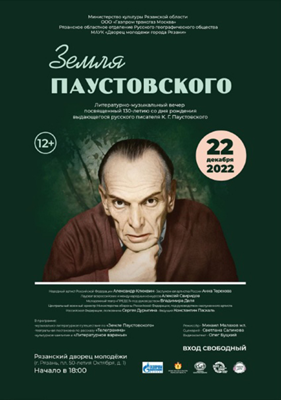 22 декабря в Рязанском дворце молодёжи прошел литературно-музыкальный вечер «Земля Паустовского», посвященный 130-летию выдающегося русского писателя. В мероприятии, организованном Рязанским областным отделением Русского географического общества при поддержке ООО «Газпром трансгаз Москва» и Министерства культуры Рязанской области, приняли участие первый заместитель Председателя Правительства Рязанской области Анна Рослякова, Герой России, почетный полярник, почетный гражданин г. Рязани Михаил Малахов, приглашенные гости, представители СМИ, а также сотрудники библиотеки им. Горького.