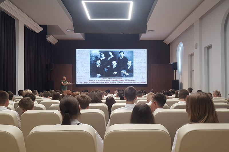 Мальчишки и девчонки услышали рассказ о том, какой огромный творческий путь проделал маленький крестьянский мальчик в лаптях, прежде чем стать известным на всю страну композитором, автором Гимна СССР и России и знаменитой песни «Священная война».