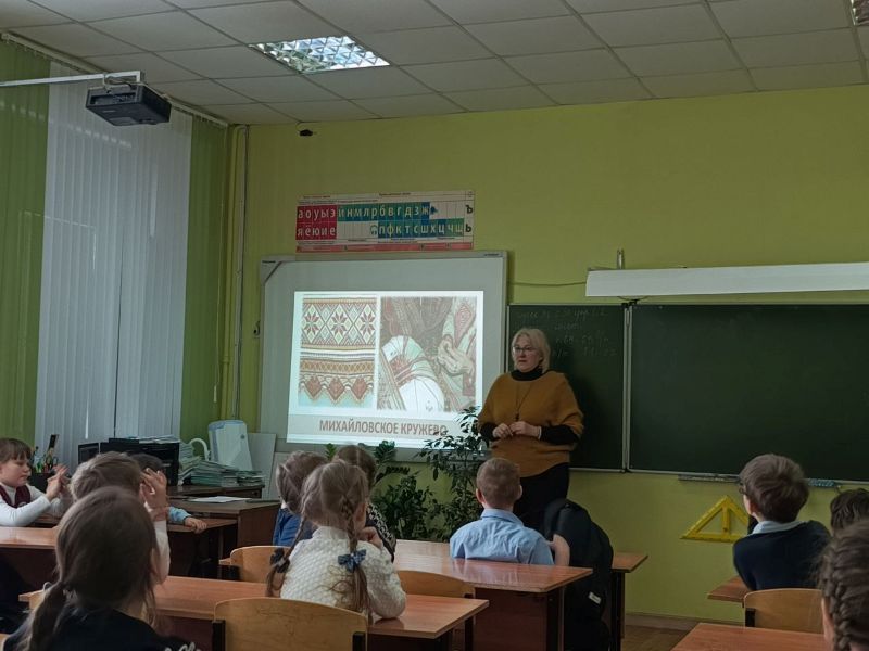Во время беседы мальчишки и девчонки активно участвовали в музыкальной викторине, отвечали на вопросы, слушали историю возникновения самых известных промыслов Рязанского края. Огромный интерес вызвал рассказ о значении цвета в уникальном промысле нашего края – Михайловском кружеве. Кружево – относительно новый вид народного искусства. Даже наиболее старые европейские образцы относятся лишь к концу 15 века. На рязанской земле, в городе Михайлове, плести кружево начали в середине 18 века.