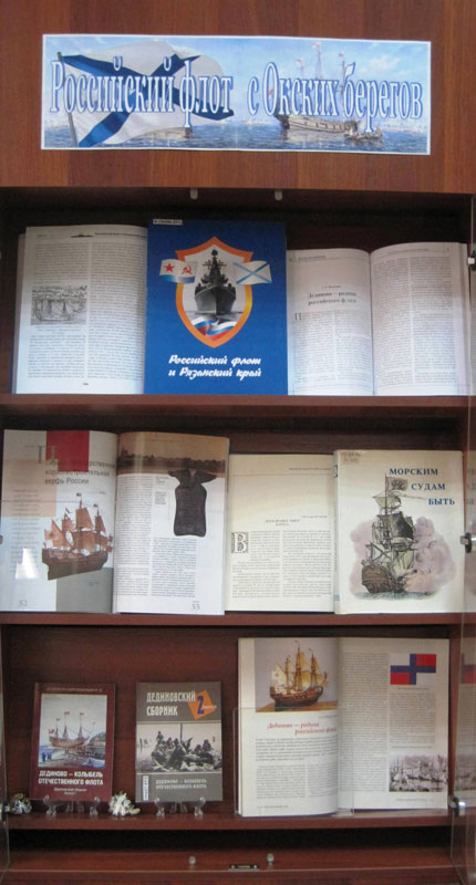 Краеведческий информационный отделВ краеведческом отделе открыта книжная выставка, посвященная 350-летию основания Дединовской государственной кораблестроительной верфи. Раньше село Дединово Зарайского уезда относилось к Рязанской губернии (ныне – Луховицкий район Московской области).