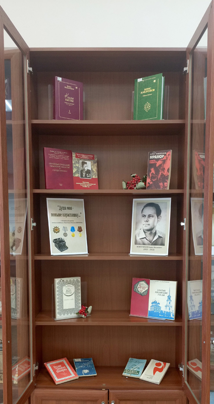 На выставке представлена биографическая литература о писателе-фронтовике и его книги «Вечная любовь», «Два крыла», «Домашний очаг» и другие.